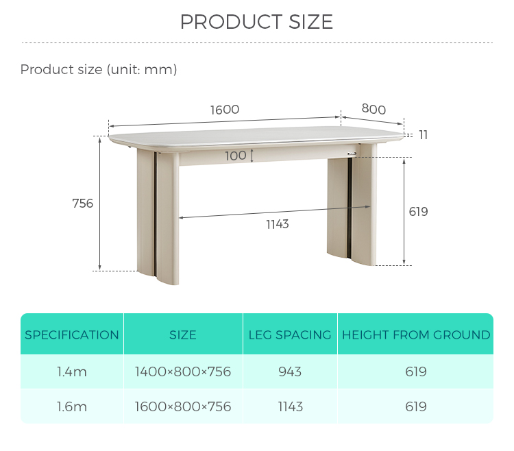 Размеры: 1600 мм (Д) × 800 мм (Ш) × 756 мм (В) — идеально для 4–6 мест