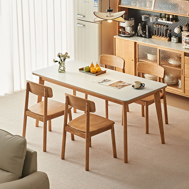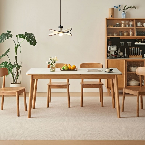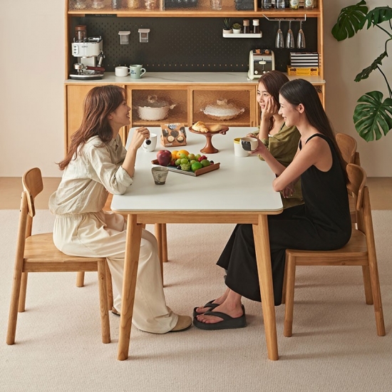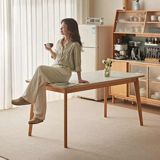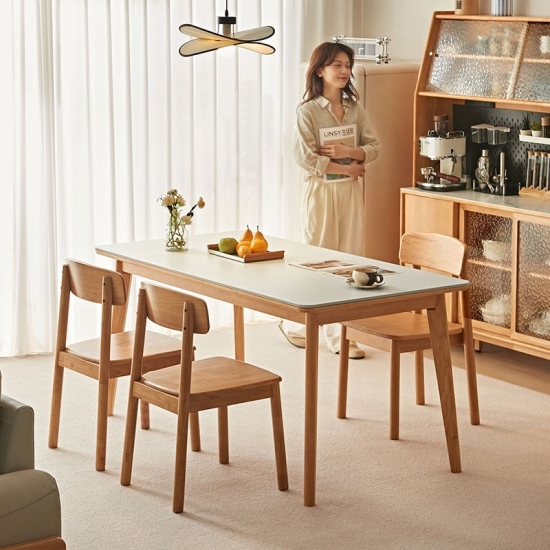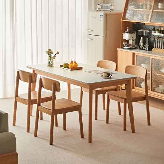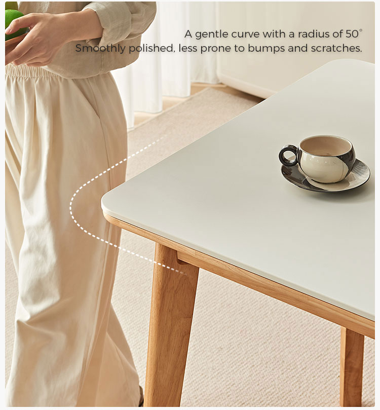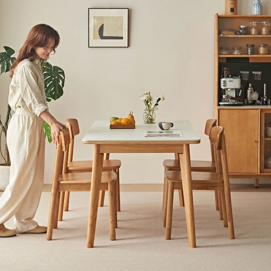 Основание и ножки: Стол опирается на прочный и элегантно простой каркас, выполненный из ножек из массива дерева. Ножки, как правило, имеют чистую, гладкую отделку, часто светлого натурального оттенка или чисто белого цвета, чтобы гармонировать со столешницей.