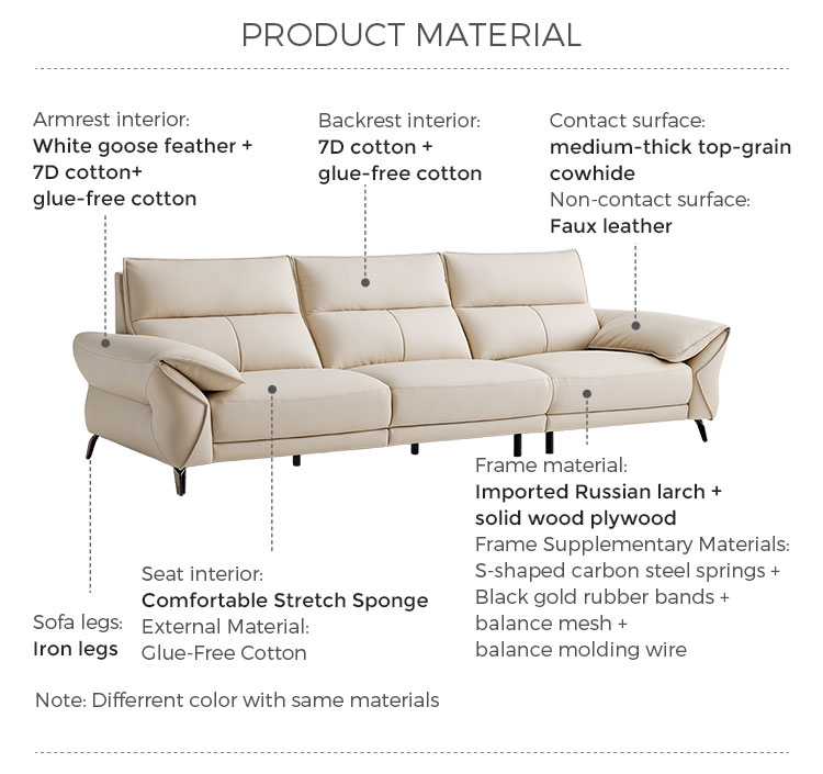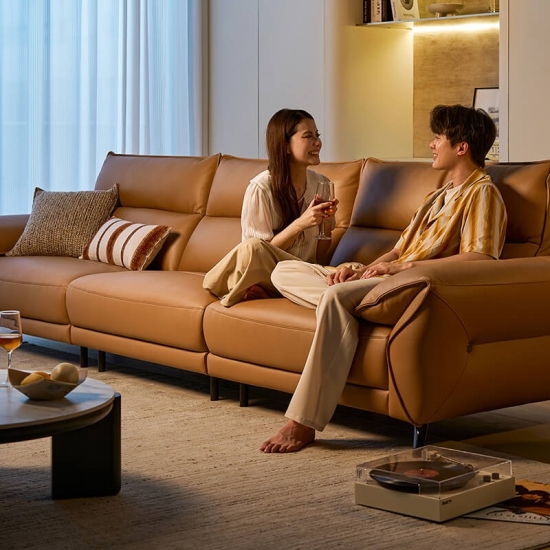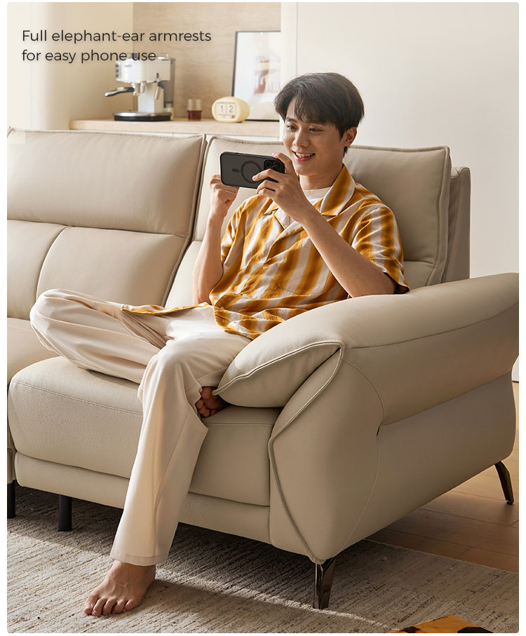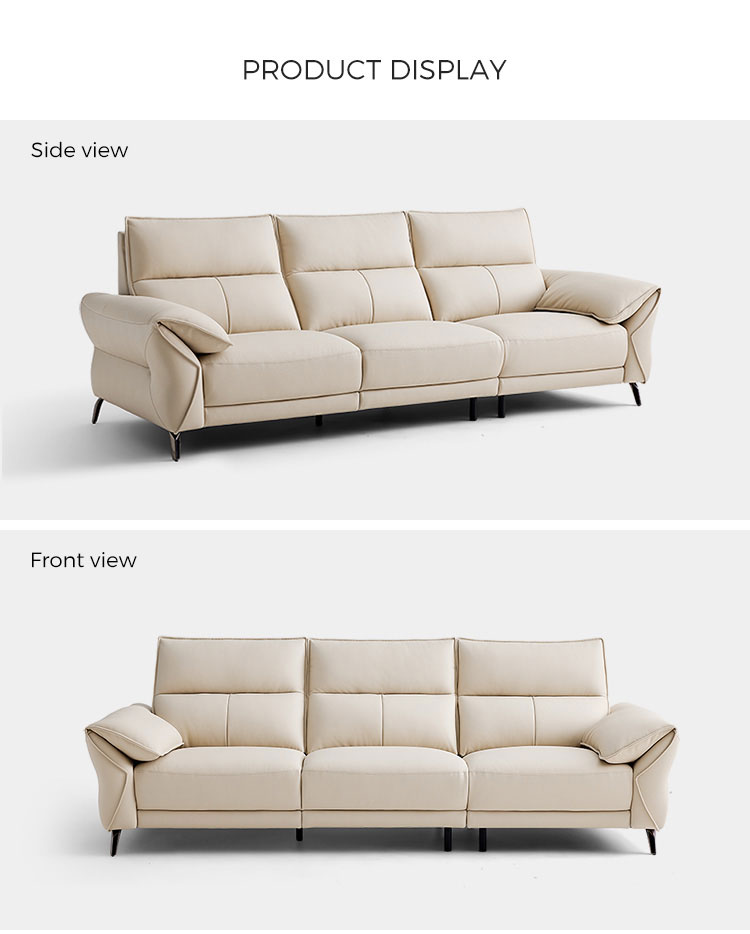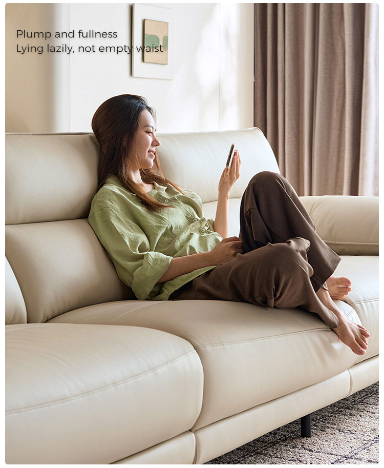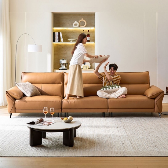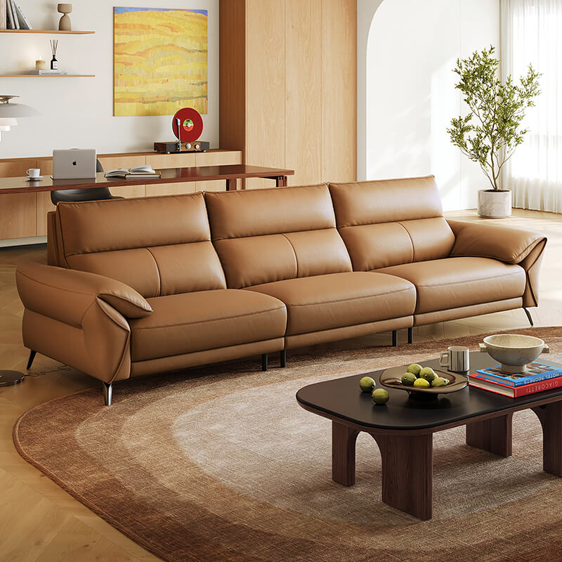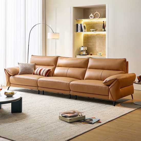 Обивка из высококачественной кожи: этот диван, изготовленный из высококачественной кожи высшего качества, мягкий и эластичный на ощупь, а также долговечен. Натуральная поверхность устойчива к износу и со временем приобретает уникальный характер, гарантируя, что диван станет ещё красивее со временем.