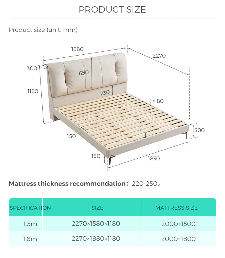 Оснащен прочной реечной системой, разработанной для обеспечения оптимальной поддержки матраса, способствуя правильному выравниванию позвоночника и длительному комфорту. Точная столярная работа в деревянной конструкции обеспечивает бесшумную жесткость. Обивка отличается аккуратной строчкой и бесшовным соединением материалов.