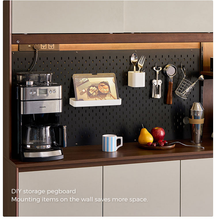 Конструкция с несколькими выдвижными ящиками и перфорированной панелью – Сочетает плавно выдвигающиеся ящики с регулируемыми перфорированными панелями для индивидуальной организации пространства.