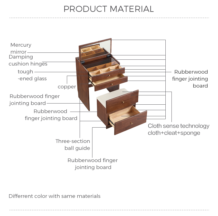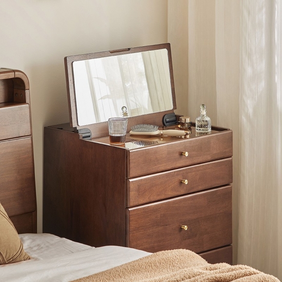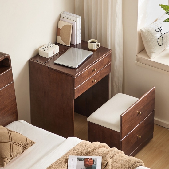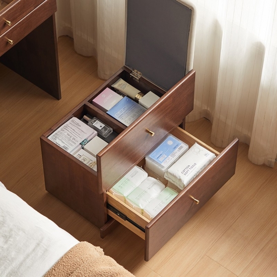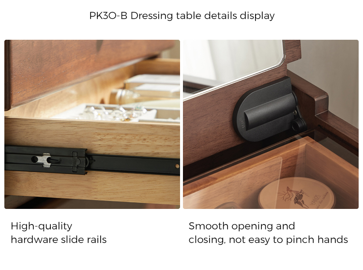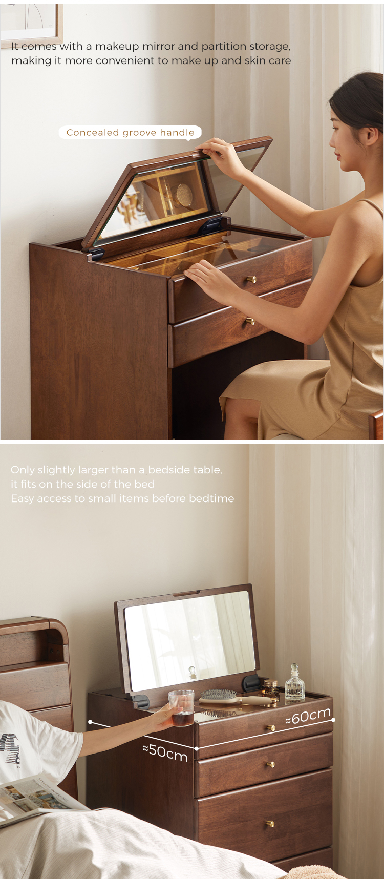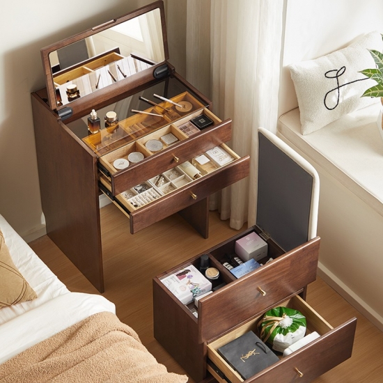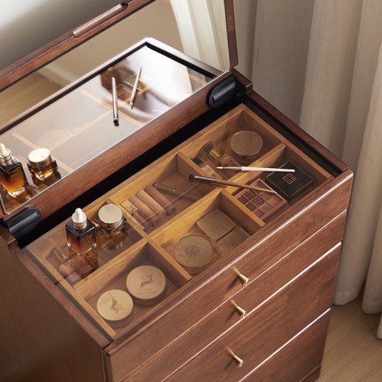 Умное хранение: плавно закрывающиеся ящики, обшитые войлоком, отделения для украшений и скрытое отделение для табурета.