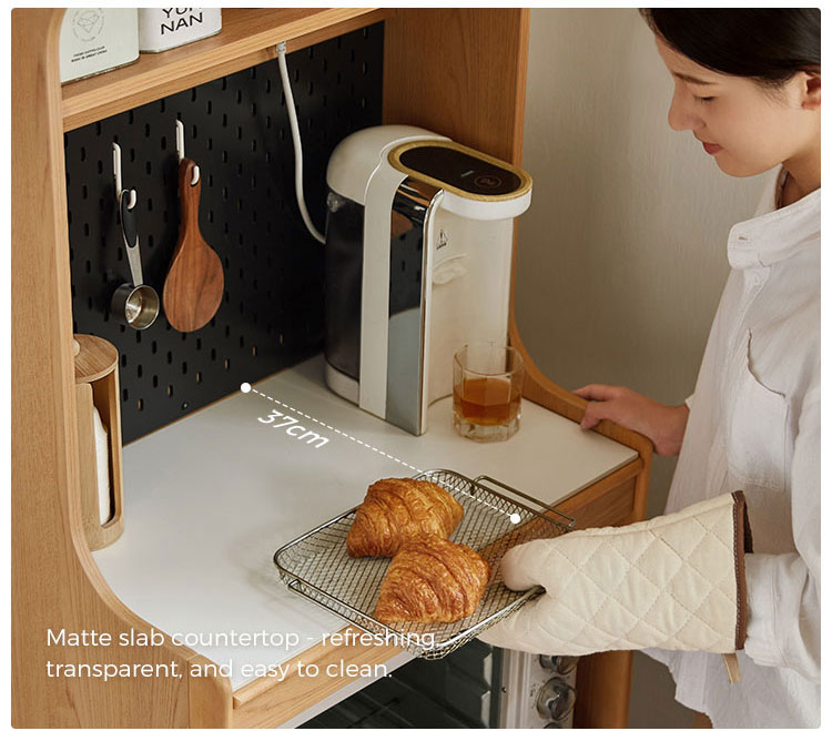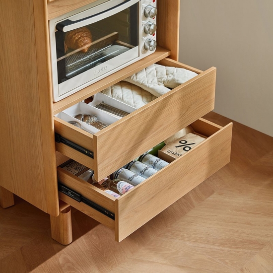 Практичное решение для хранения: Внутри хорошо организованные полки и ящики предлагают достаточно места для посуды, постельного белья и столовых принадлежностей, поддерживая порядок и не допуская беспорядка в пространстве.