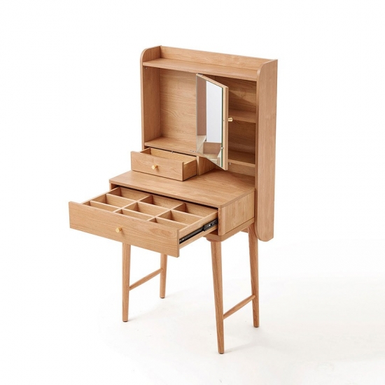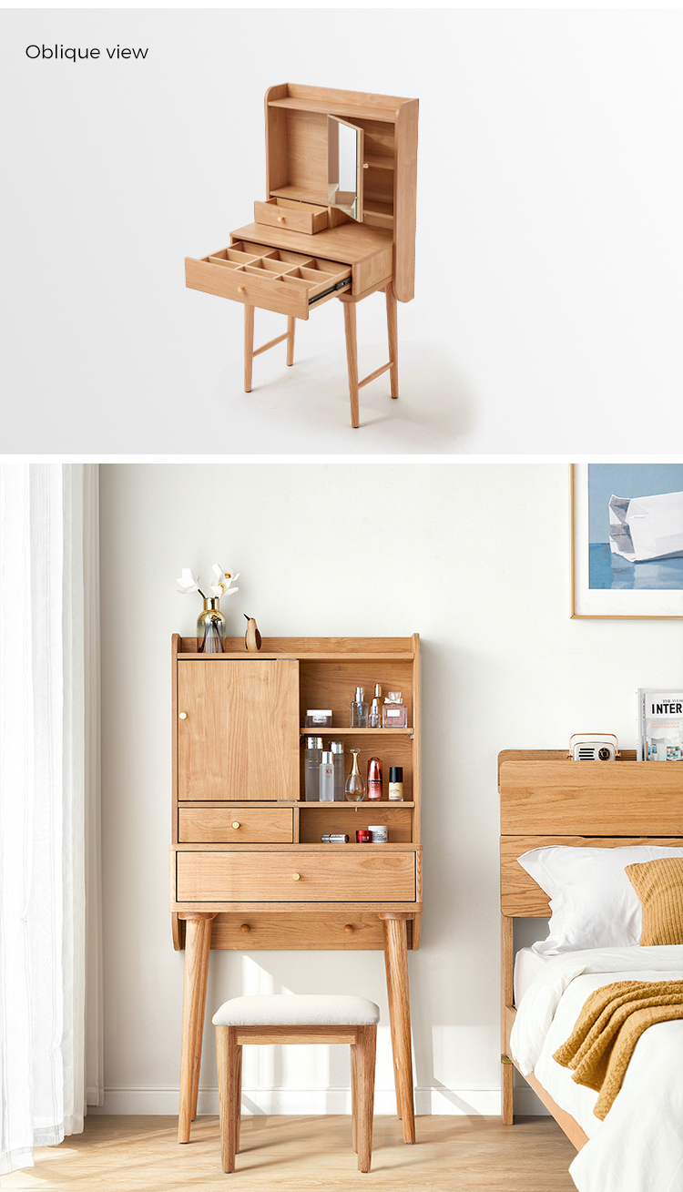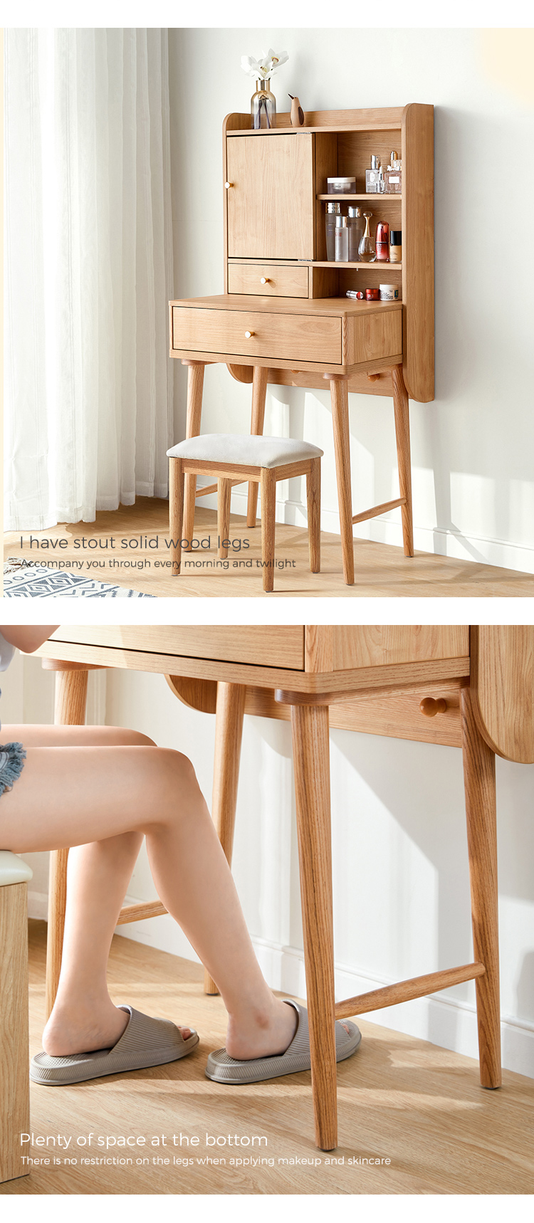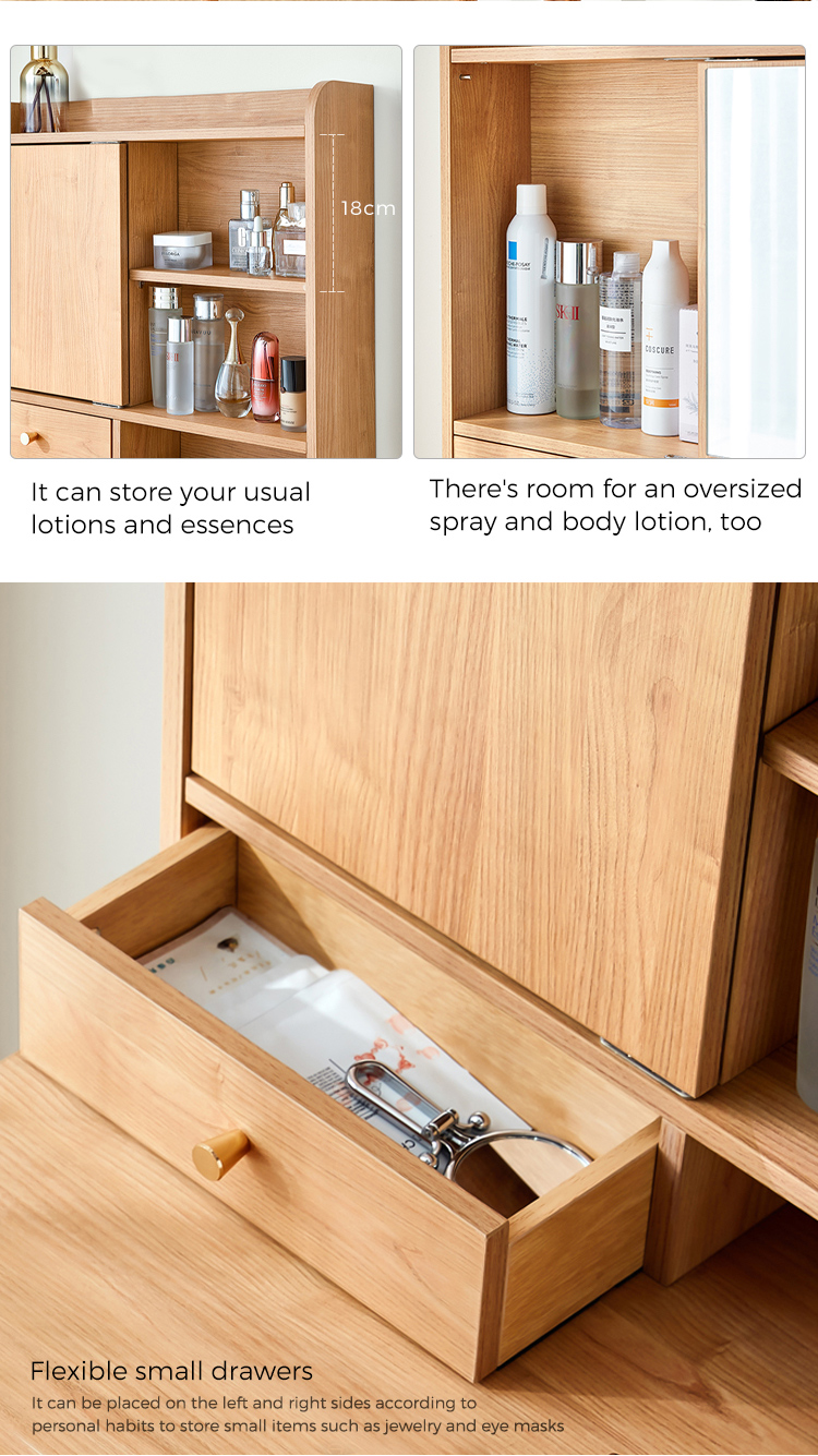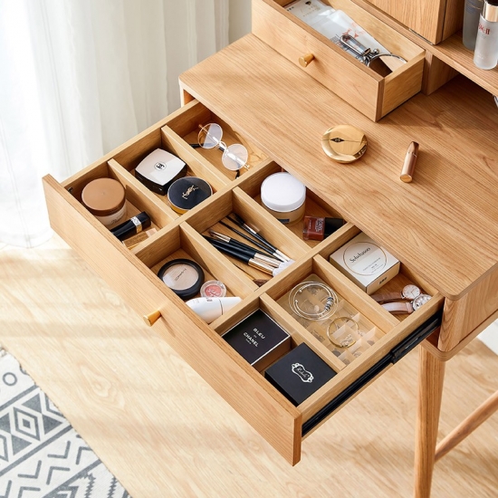 Умное хранение: плавно закрывающиеся ящики, обшитые войлоком, отделения для украшений и скрытое отделение для табурета.