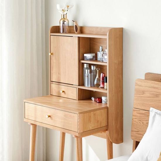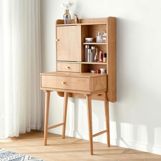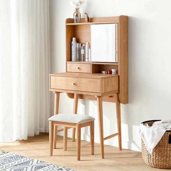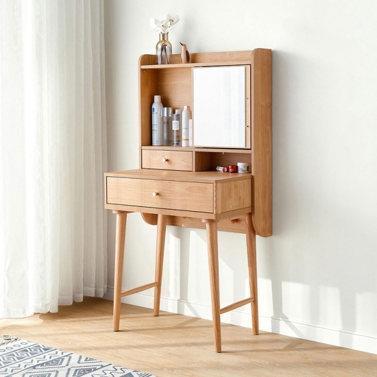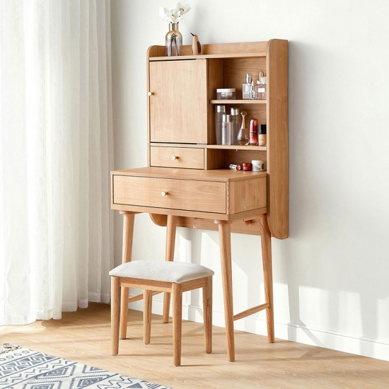 Изготовленный из массива твердой древесины, этот туалетный столик излучает тепло и изысканность. Его гладкая, богатая зернистостью поверхность демонстрирует органическое очарование натурального дерева, отделанного защитным матовым лаком или морилкой медового оттенка для повышения долговечности и блеска.